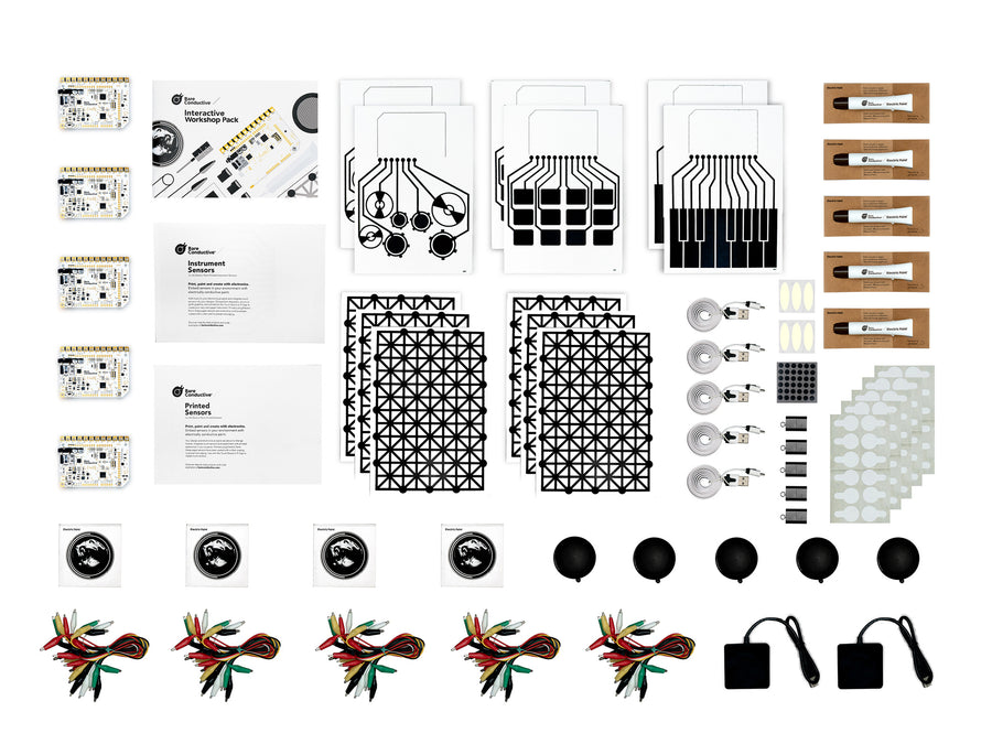 The Interactive Workshop Pack consists of all the components for 3 creative workshops featuring smart sensors: create musical instruments, game controllers and interactive posters using the Bare Conductive Electric Paint, Printed Sensors and Touch Board.