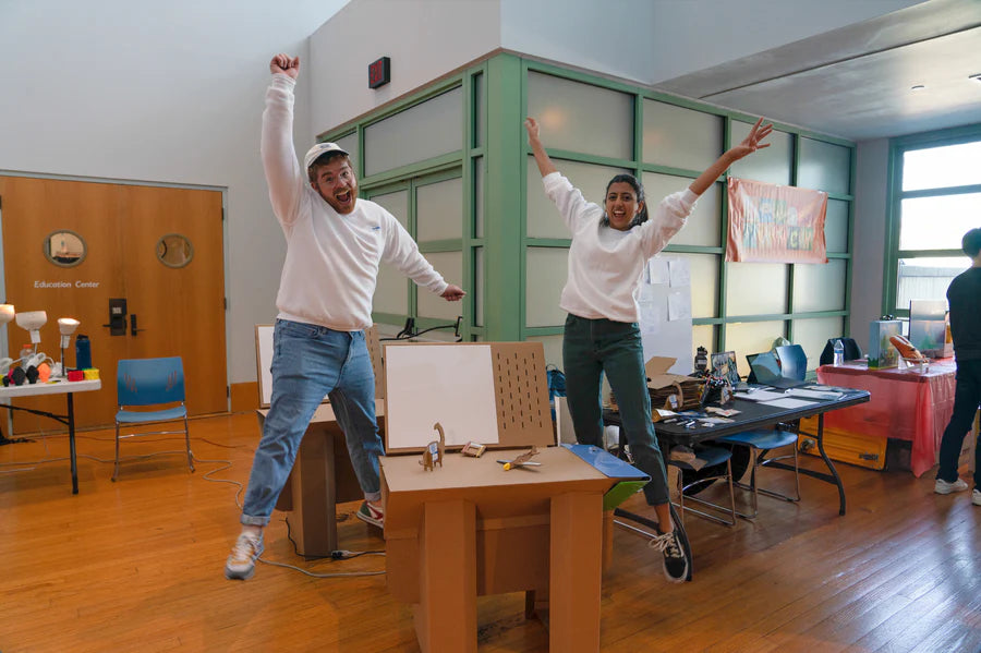 Hi! We’re Kausi (“cow-see”) and Max ("max")—graduates of the Integrated Product Design Master’s program at UPenn and founders of Chompshop. As product designers, we know the power of quick, hands-on prototyping for testing ideas and refining designs. We’ve seen how this process sparks problem-solving and creativity, especially for kids. However, the tools that make prototyping easy for adults are often too complex or unsafe for young makers, making materials like cardboard more frustrating than fun. We’re here to change that with tools for kids!